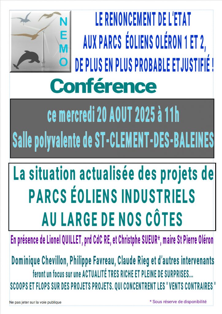 15 juillet 2023Conférence du Collectif NEMO (Non à l’Éolien Marin à Oléron et à sonextension), animée par Dominique Chevillon, sur les actualités duprojet de la zone industrielle éolienne marine, prévue au larged’Oléron, de Ré et de la Vendée, ainsi que sur les nombreusesdémarches et les actions entreprises par le Collectif NEMO, le jeudi27 juillet à 18h30, à la salle du Godinand de Saint-Clément-des-Baleines dans l’île de Ré.Présence et intervention de Monsieur le Maire de Saint-Pierre d’Oléron, ChristopheSueur, Vice-président de la CdC (Communauté de Communes) d’Oléron, Conseillerdépartemental de Charente-Maritime en responsabilité des infrastructures portuaires,très engagé contre les projets de cette zone industrielle offshore au large de nos côtes.Des intervenants, élus, ingénieurs, naturalistes, et spécialistes des questionsénergétiques. Les Associations LPO (Ligue pour la Protection des Oiseaux), Nature-Environnement 17, Ré-Nature-Environnement, de la Pêche et Associationsenvironnementalistes.Débat et réponse aux questions de l’assemblée.Cette conférence est organisée par Madame le Maire de Saint-Clément, l’APSSC(Association de Protection des Sites de Saint-Clément), en collaboration avecl’Association écocitoyenne CAPRES-AUNIS de Dompierre-sur-Mer, DominiqueChevillon du Collectif NEMO (Non à l’Éolien Marin à Oléron et à son extension) [...] Lire la suite…
